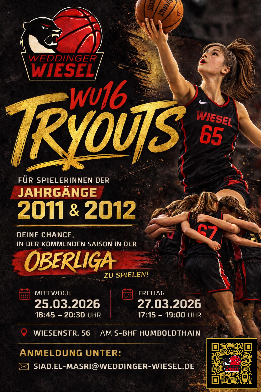 Die Weddinger Wiesel öffnen die Türen für ihre WU16-Tryouts und suchen motivierte Spielerinnen für die kommende Oberliga-Saison. In einer offenen und freundlichen Trainingsatmosphäre kannst du zeigen, was in dir steckt – ganz unverbindlich, ohne Druck, dafür mit viel Spaß am Basketball und guter Stimmung in der Halle.